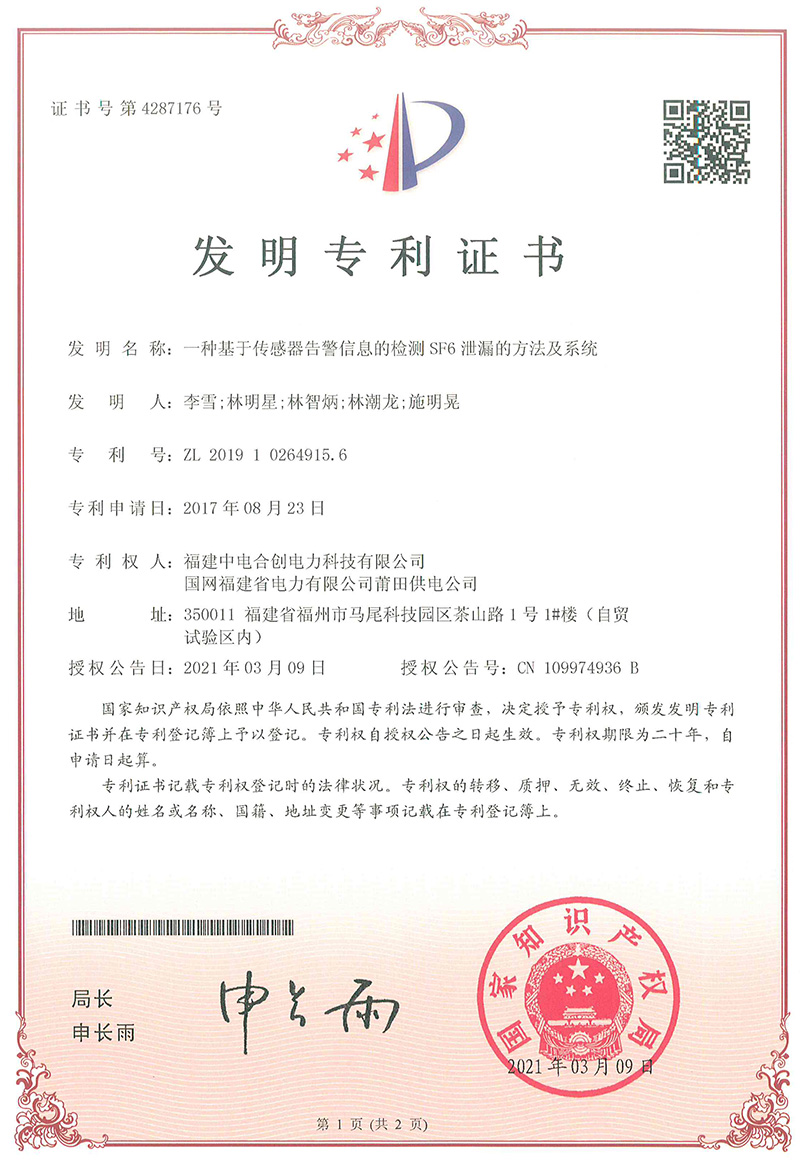 一種基于傳感器告警信息的檢測(cè)SF6泄漏的方法及系統(tǒng)發(fā)明專利證書(shū)